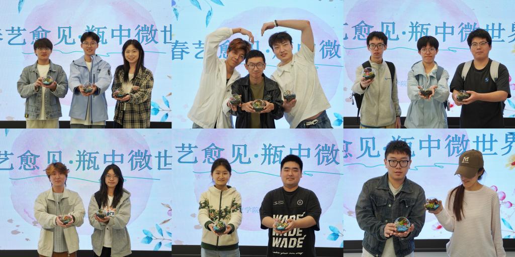 分享环节。同学们围绕“最让你感到安心的是哪一部分”“如果小世界会说话,它会说什么”等问题自愿交流,部分同学与朋辈骨干一对一倾听,在无评判的氛围中梳理内心感受。活动最后,参与者手持生态瓶合影留念。
